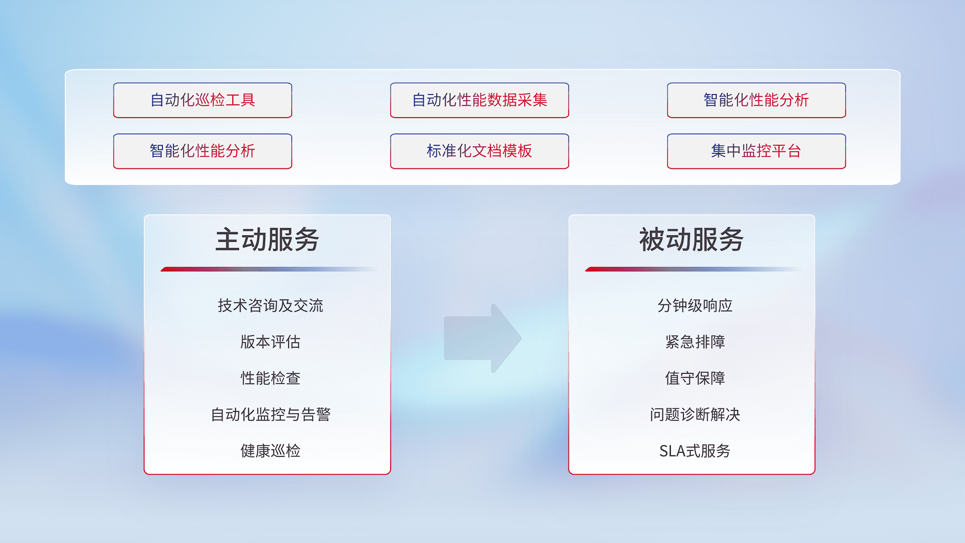 智能化工具和标准化文档,,保障服务质量,,,提供主动服务(包含技术咨询、、版本评估、、、性能检查、、自动化监控与告警、、、健康巡检)和被动服务包含(分钟级响应、、、紧急排障、、、值守保障、、、问题诊断解决、、SLA服务)。。